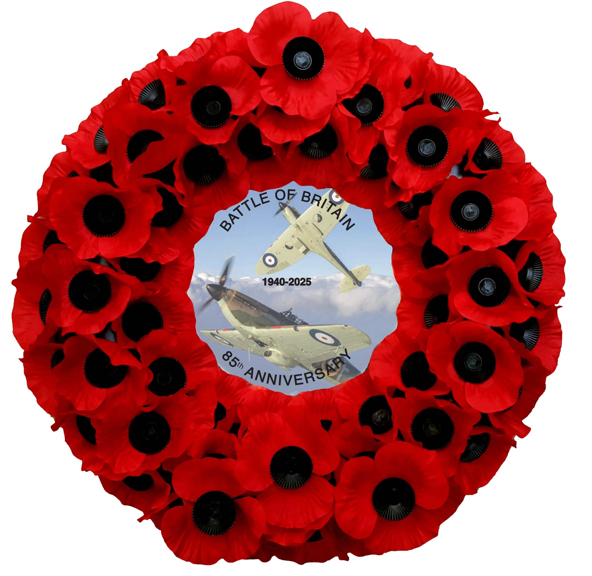 The No. 2 Battle of Britain 1940 poppy wreath is made from a plastic base and the poppy petals are made from acetate taffeta which have been crimped to give it a distinctive shape. The No. 2 Battle of Britain logo is also available for No. 7 and No. 8 poppy wreaths. Each wreath comes with a Remembrance card attached which is biodegradable and so it will not be supplied with a plastic envelope.